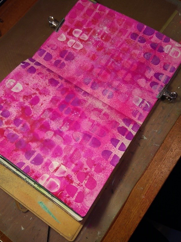 Zo ziet de achtergrond eruit. Ik heb steeds dezelfde stencil gebruikt. Het wit is witte heavy body gesso van Prima. Een stencil kan je dus zowel voor verf, als sprayinkt, als inkt uit een kussen gebruiken, of als mal om door te stempelen. Dat heb ik op mijn pagina ook gedaan. Enige nadeel van archival is, dat het niet van je stencil afgaat.